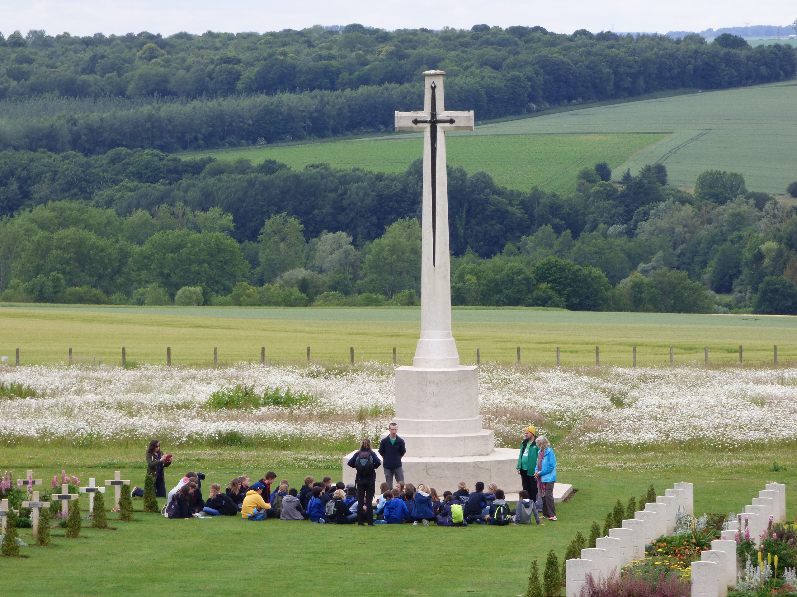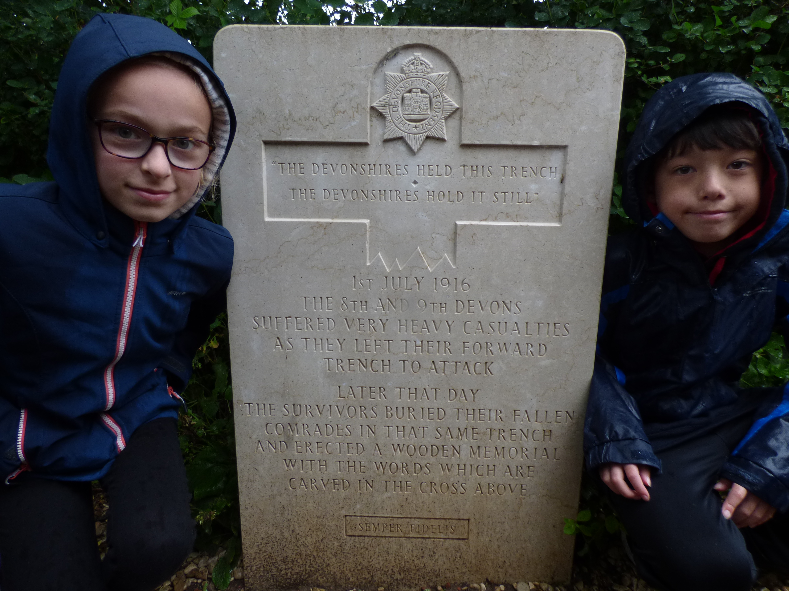 Indeed the heavens opened. Most of us listened to the key instruction to bring water-proof jackets. As the rain pelted down, a sombre and poignant mood enveloped us. On the 1st July 1916, the 9th Devonshire Regiment attempted to take the town of Mametz from the Germans. However, the introduction of the machine gun by the Germans had significant consequences despite Captain Martin’s (of the Devonshires) warning being ignored by superiors.: 160 died in just 10 minutes. The rain could not stop us – we remembered.